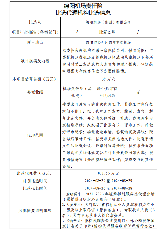 綿陽(yáng)機(jī)場(chǎng)責(zé)任險(xiǎn) 比選代理機(jī)構(gòu)比選信息